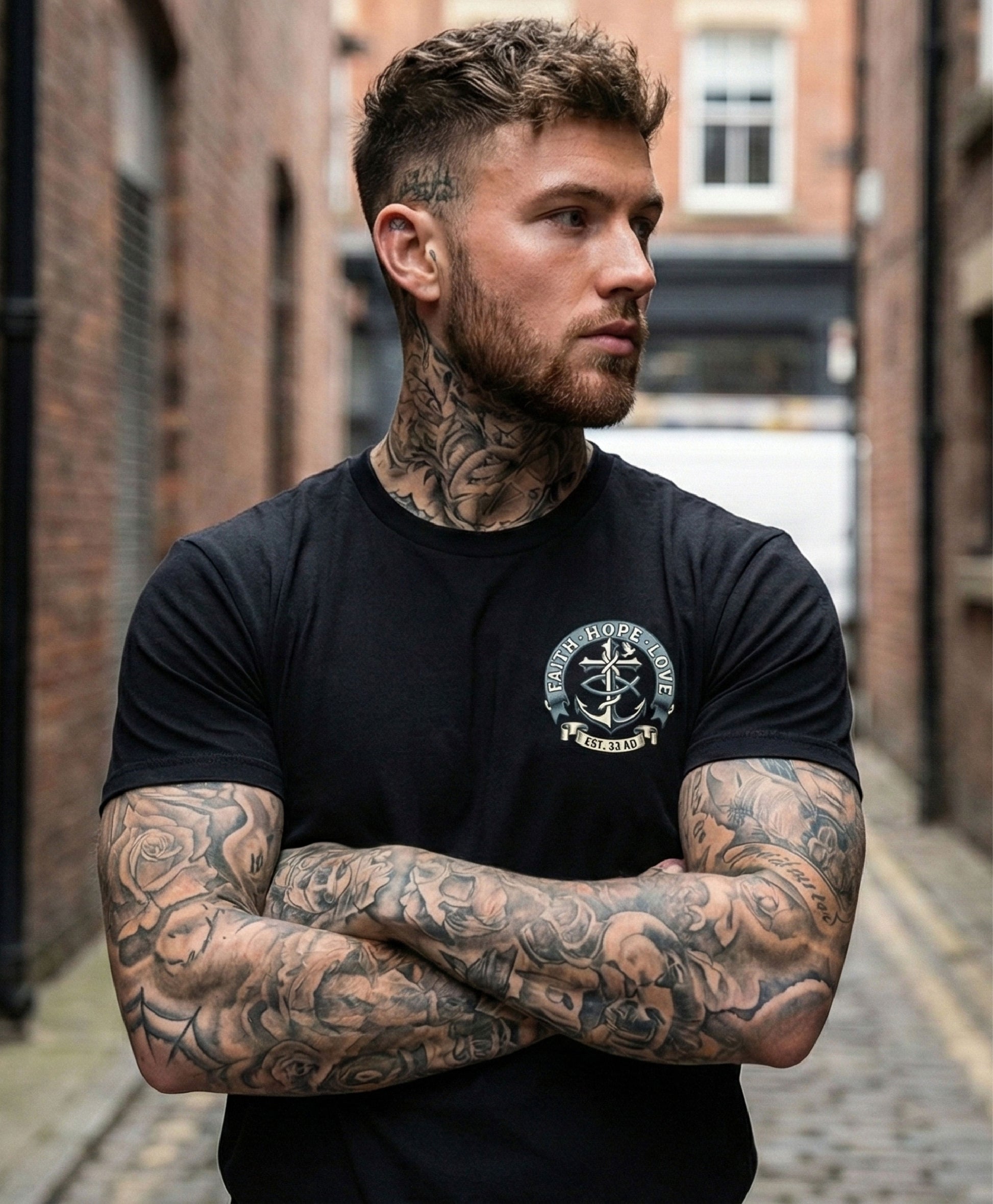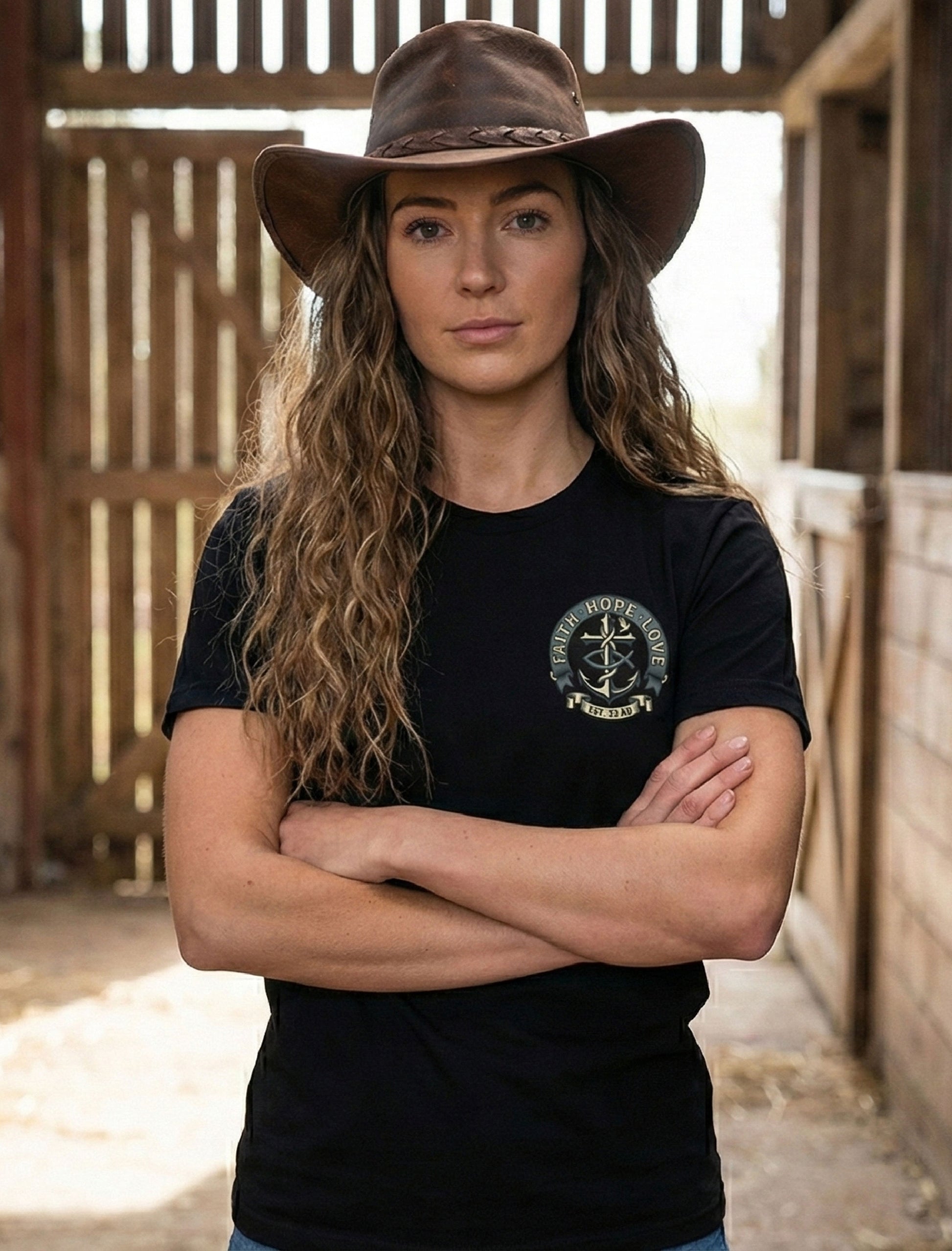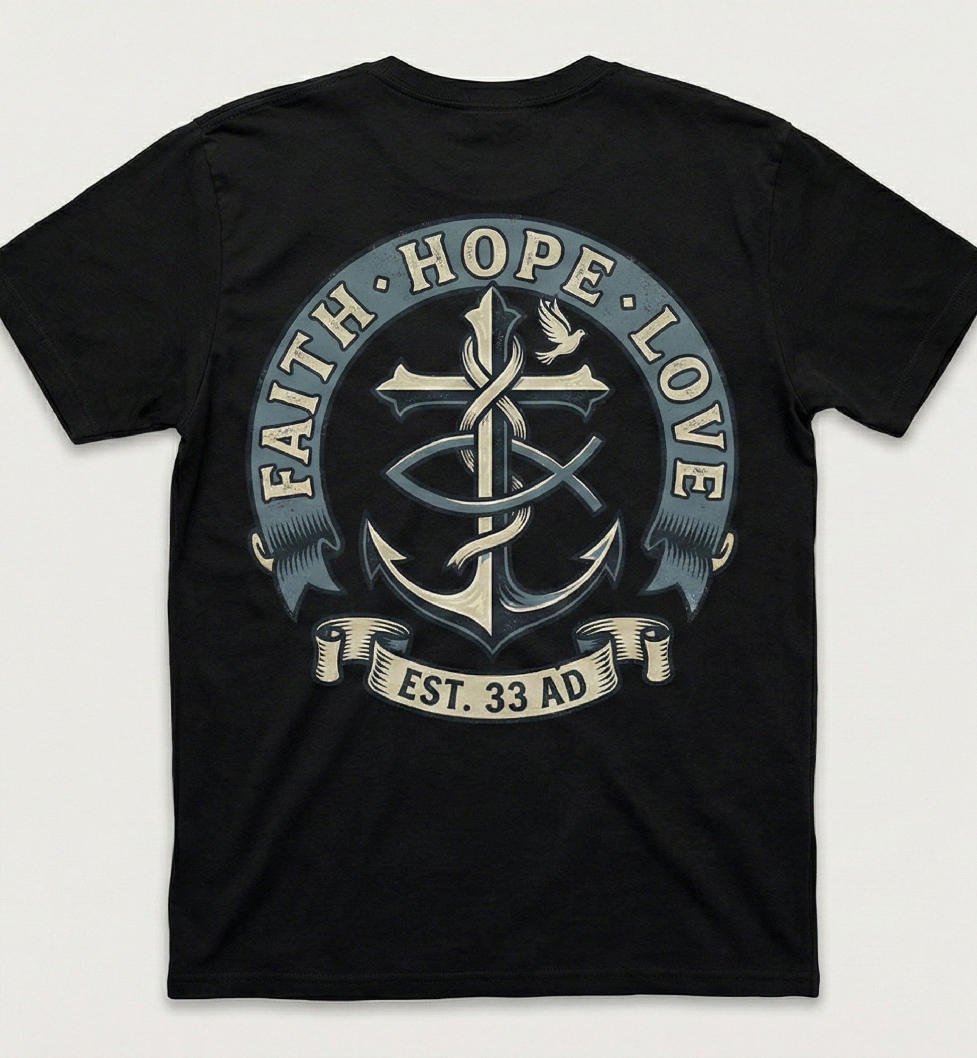 The bold back graphic features a powerful fusion of the Cross and the Anchor, symbolizing Christ as the secure "anchor of the soul" in any storm. Surrounded by the essential virtues of FAITH • HOPE • LOVE and marked EST. 33 AD, it connects you to the ancient, unshakable history of the Gospel.